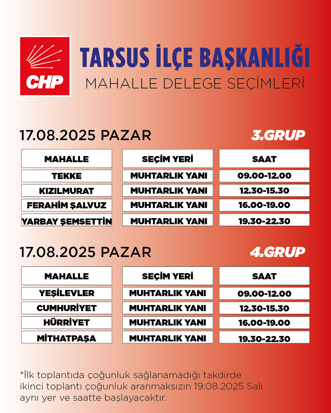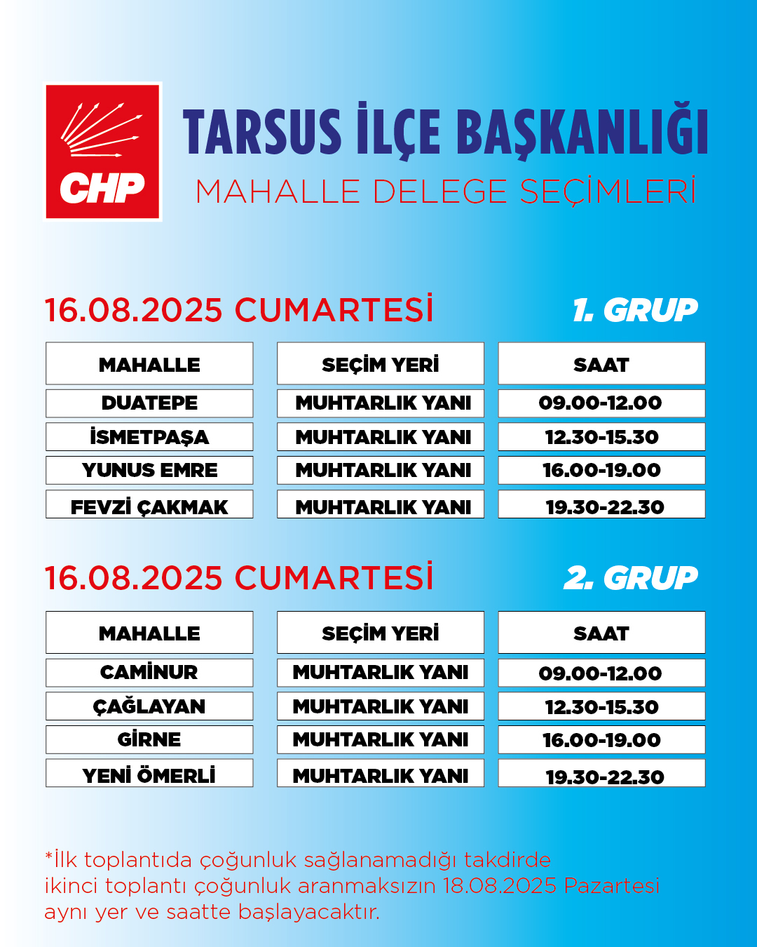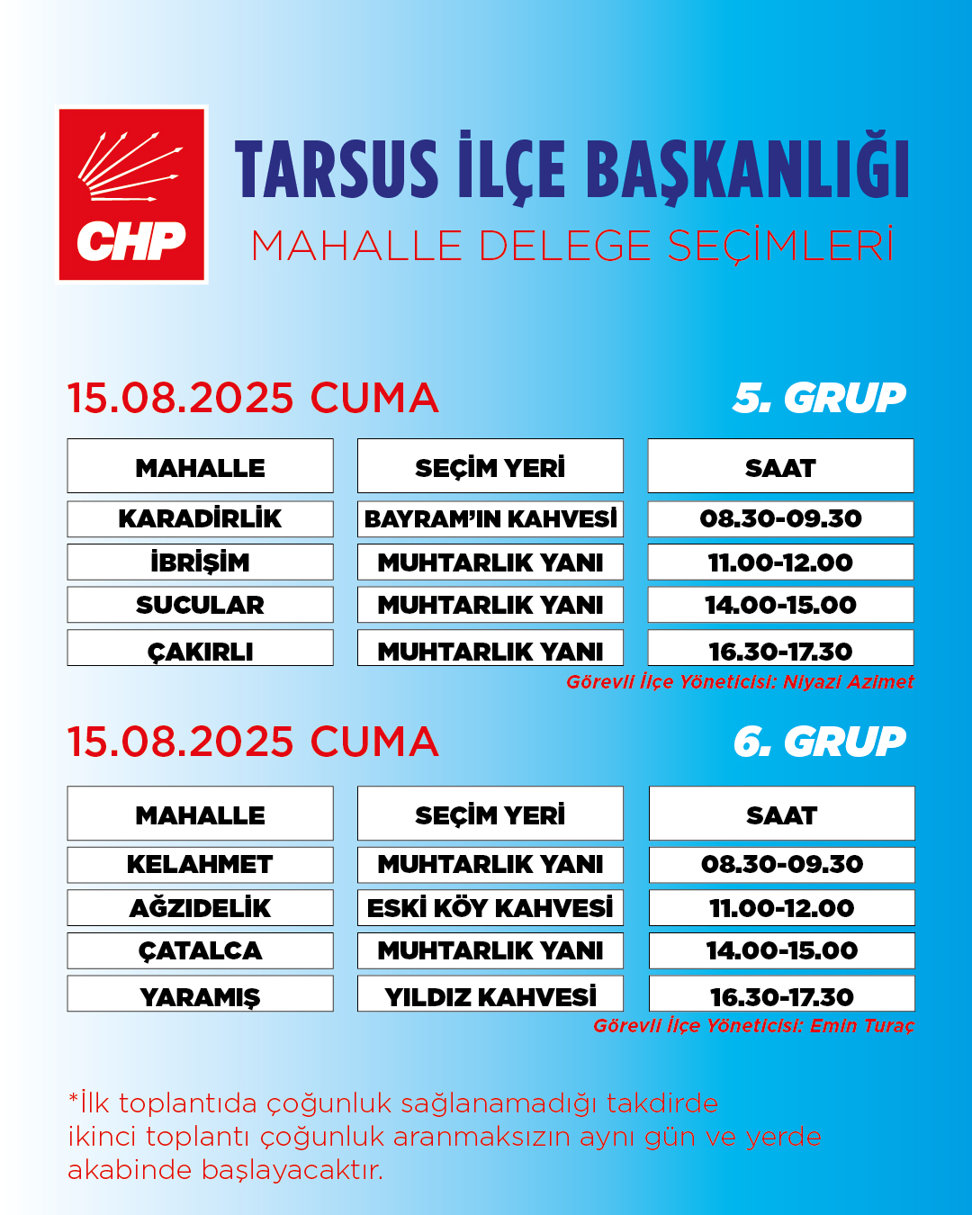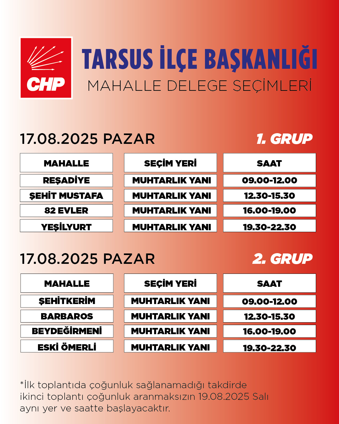 CHP Tarsus Mahalle Delege Seçim Takvimi aşağıdaki gibidir.