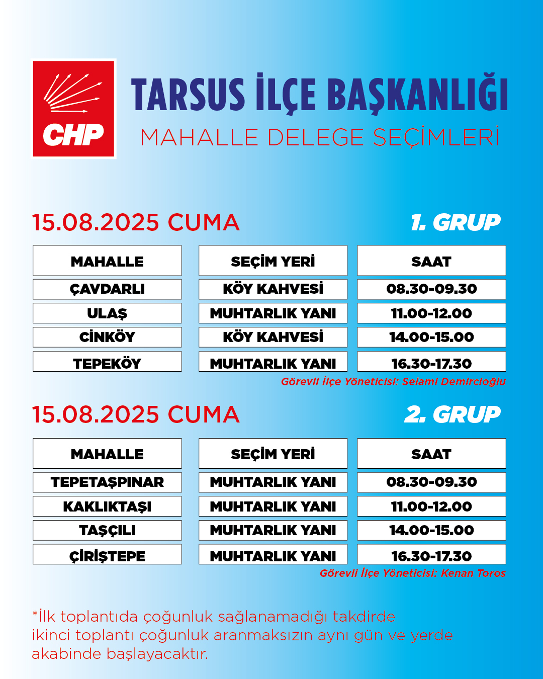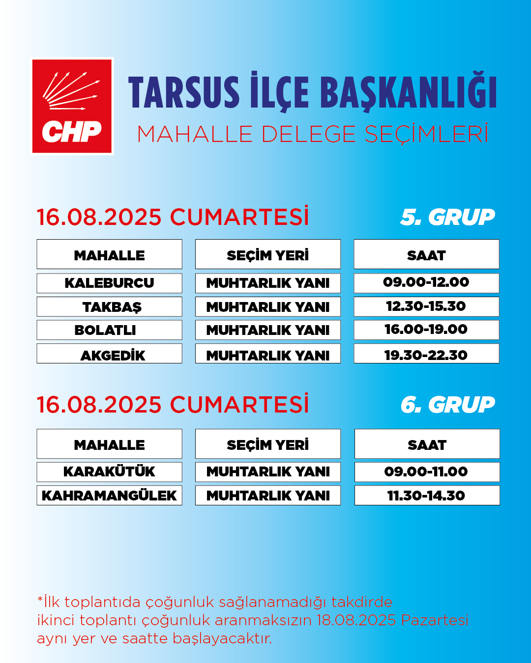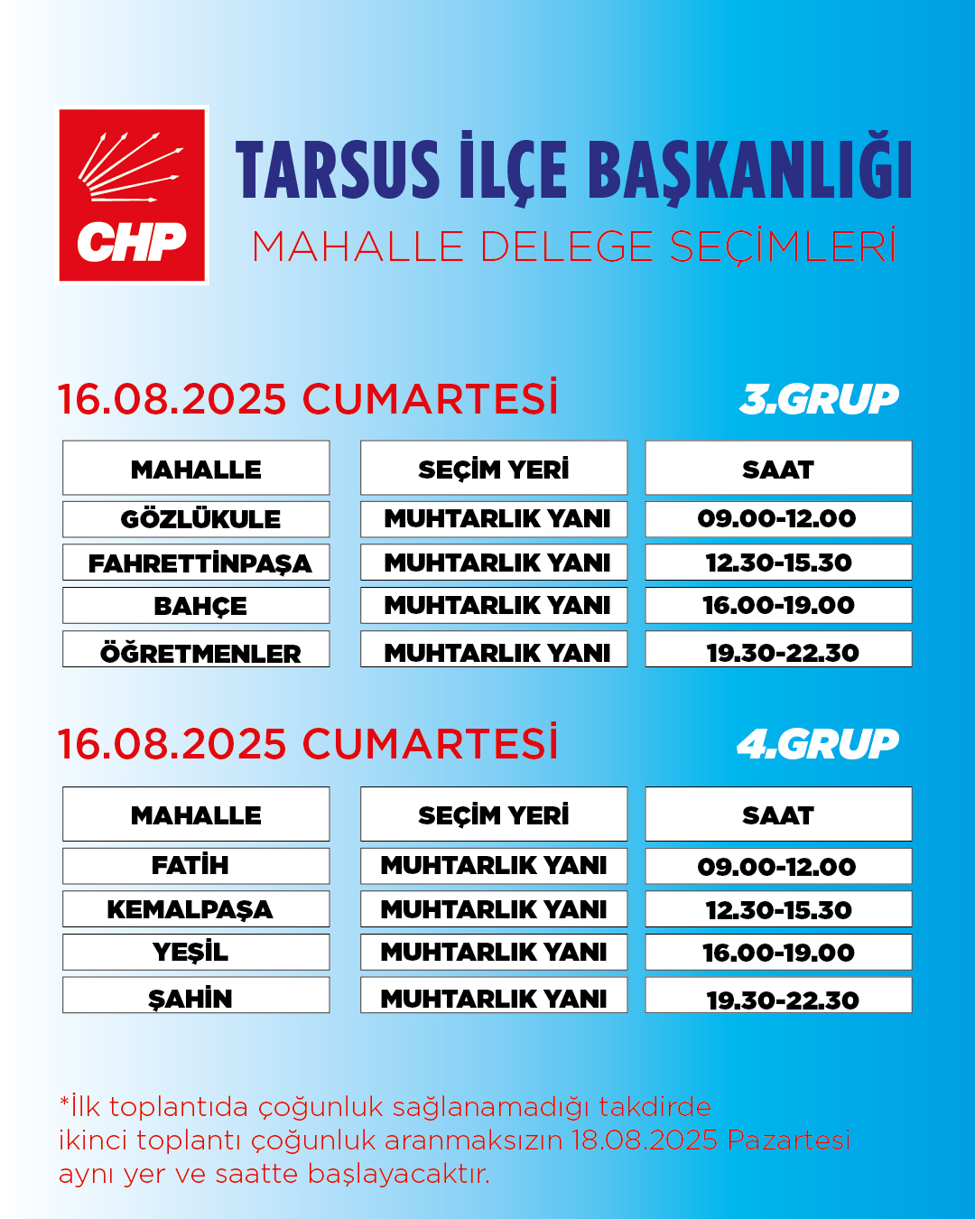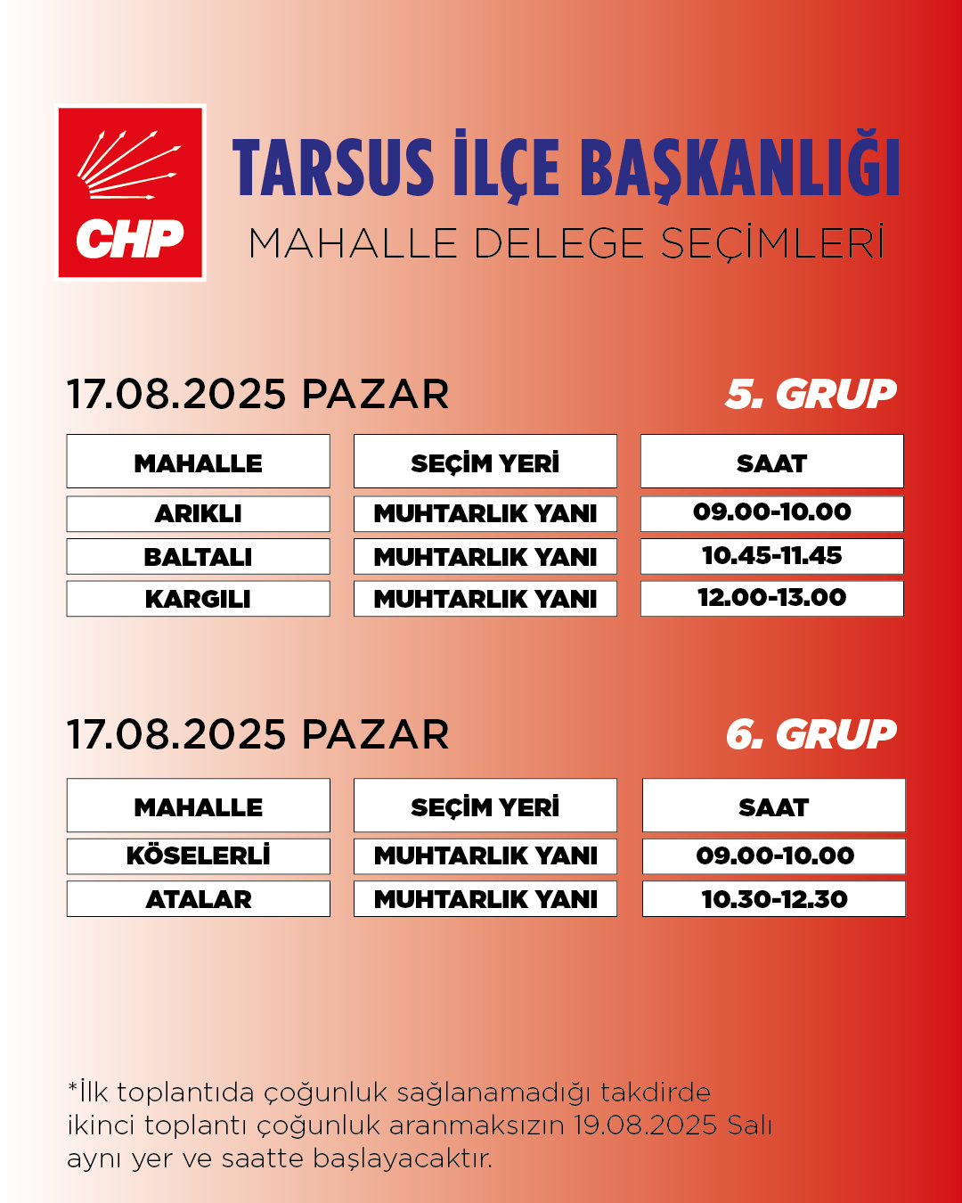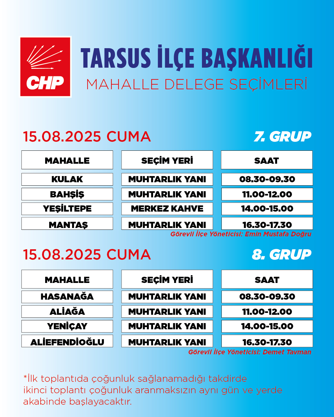 CHP Tarsus Mahalle Delege Seçim Takvimi aşağıdaki gibidir.